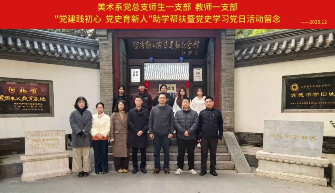 为深入学习贯彻党的二十届四中全会精神,落实“办好人民满意的教育”工作要求,切实把党员关怀送到最需要、最困难的学生手中。近日,美术系党总支师生一支部、教师一支部将励志帮扶与党史学习有机融合,组织党员与系内勤工助学困难学生,前往保定市勤工俭学留法纪念馆开展党日活动,以精准帮扶传递组织温暖,以红色教育筑牢理想根基。