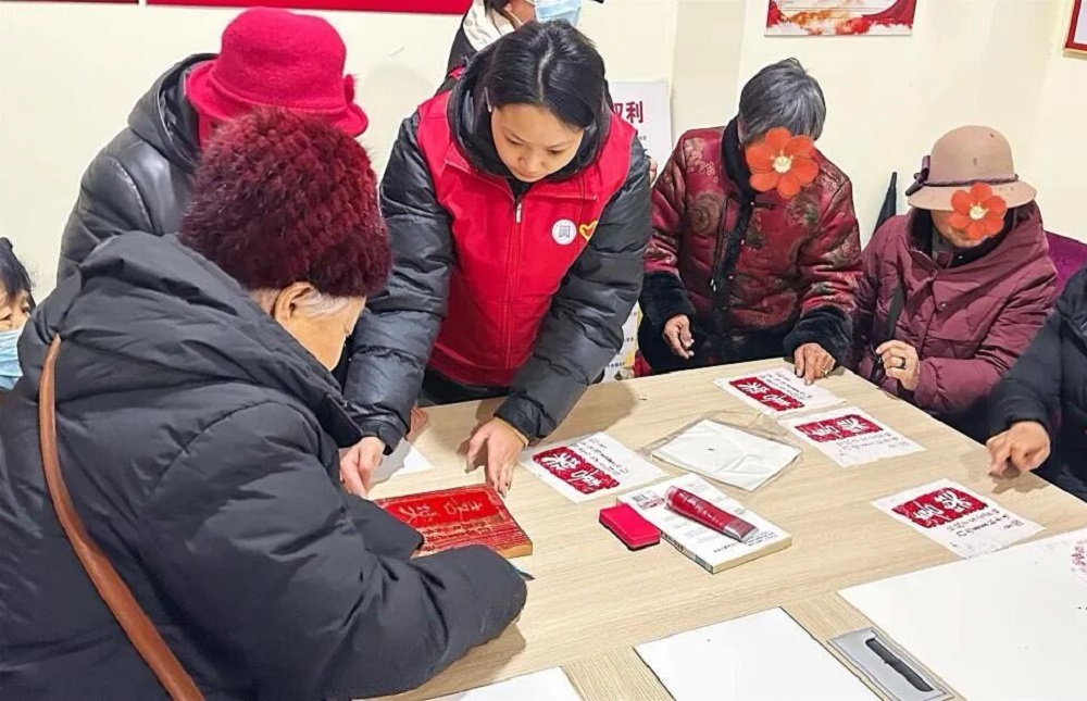 活动现场暖意融融,志愿者与老人们促膝长谈。在拓印体验环节,志愿者耐心讲解拓印的历史与制作技巧,并帮助老人们完成上墨、拓印、揭纸等步骤。当一张张印有“福”字、“喜乐”等吉祥图案的拓印作品新鲜出炉时,老人们脸上洋溢着喜悦,纷纷展示自己的作品,现场充满欢声笑语。